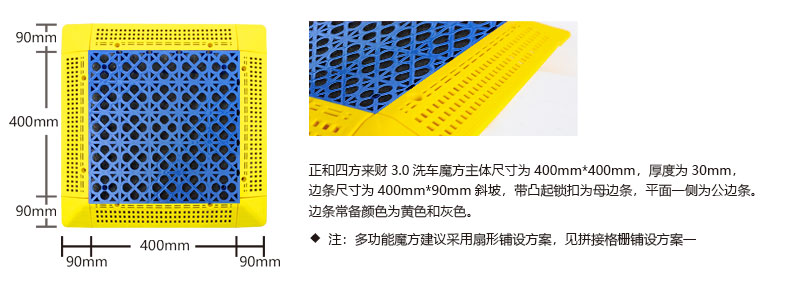 1. 分為3.4.5.厚度,解決不同厚度,統(tǒng)一紋路的問題 2. 啞光平紋設(shè)計,防滑,美觀,易清潔 3. 選用高級原料,加入其他輔料,顏色亮麗,無異味,無污染 4. 顏色為紅黃藍綠黑灰六色,滿足客戶用色需求,搭配屬于自己的風(fēng)格 5. 通扣鎖扣設(shè)計,容易鋪設(shè)且容易拆卸打理 6. 加強支撐,不容易出現(xiàn)壓壞壓斷現(xiàn)象,滿足大多數(shù)車輛施工的要求 7. 使用年限長,五年超長質(zhì)保,使用無后顧之憂 8. 十字支撐,保證承載最大化的同時,且易排泥排水