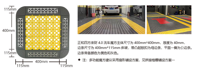 1. 分為3.4.5.厚度,解決不同厚度,統(tǒng)一紋路的問題 2. 啞光平紋設(shè)計,防滑,美觀,易清潔 3. 選用高級原料,加入其他輔料,顏色亮麗,無異味,無污染 4. 顏色為紅黃藍綠黑灰六色,滿足客戶用色需求,搭配屬于自己的風格 5. 通扣鎖扣設(shè)計,容易鋪設(shè)且容易拆卸打理 6. 加強支撐,不容易出現(xiàn)壓壞壓斷現(xiàn)象,滿足大多數(shù)車輛施工的要求 7. 使用年限長,五年超長質(zhì)保,使用無后顧之憂 8. 十字支撐,保證承載最大化的同時,且易排泥排水