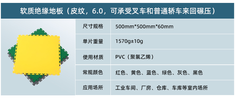 6、色彩絢,易搭配: 軟質(zhì)絕緣地板常規(guī)顏色為紅色、黃色、黑色、灰色、藍色、綠色等顏色,也可根據(jù)客戶的要求進行色彩的調(diào)整。正方形結(jié)構(gòu)讓施工搭配非常簡單。