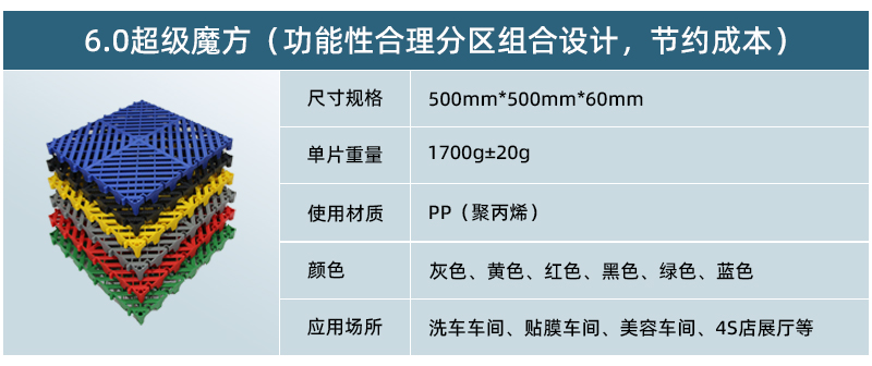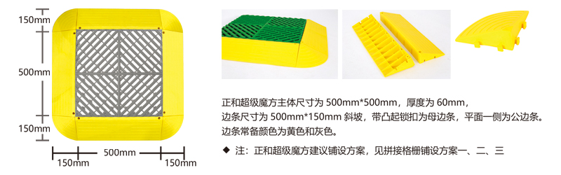 超級魔方產(chǎn)品綜合了以前產(chǎn)品的所有優(yōu)點,包括結(jié)構(gòu)設計、防滑紋路、尺寸間距、加大鎖扣、矩陣支撐等,將產(chǎn)品厚度提升到60毫米的超高厚度,真正的實現(xiàn)了汽車店鋪的免挖溝鋪設。