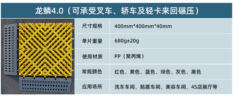 1.龍鱗紋設(shè)計,防滑,美觀,寓意好 2.選用高級原料,加入其他輔料,顏色亮麗,無異味,無污染 3.顏色為紅黃藍綠黑灰六色,滿足客戶用色需求,搭配屬于自己的風格 4.通扣鎖扣設(shè)計,容易鋪設(shè)且容易拆卸打理 5.加強支撐,不容易出現(xiàn)壓壞壓斷現(xiàn)象,滿足大多數(shù)車輛施工的要求 6.使用年限長,3年超長質(zhì)保,使用無后顧之憂 7.不同厚度,采用不同支撐,保證承載最大化的同時,且易排泥排水